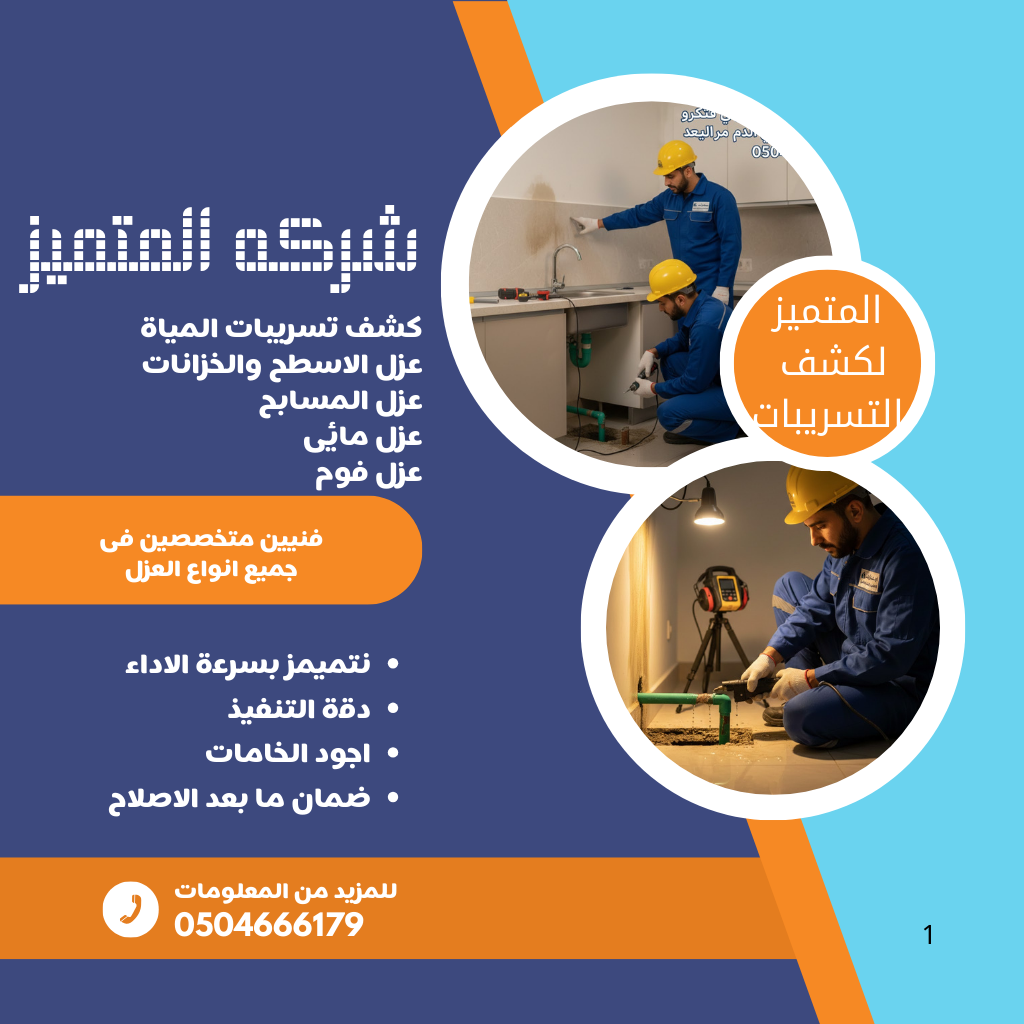 إن اختيار شركة المتميز لكشف التسريبات بالأجفر هو قرار مبني على الثقة والجودة والالتزام بالمعايير المهنية. فريقنا يتألف من مهندسين وفنيين يتمتعون بالخبرة العميقة في التعامل مع جميع أنواع التسريبات والعزل. نحن نقدم ضمانات واضحة وموثقة تغطي دقة الكشف وجودة أعمال الإصلاح والعزل المنجزة. هذه الضمانات تمنح العميل راحة البال، مؤكدة أن العمل تم بمعايير عالية ويلبي شروط كود البناء السعودي. نحن ندرك أهمية سرعة الاستجابة في حالات الطوارئ المائية، ولذلك فإن خطنا الساخن 0504666179 جاهز لخدمة عملائنا في الأجفر والمناطق المجاورة. إن هدفنا يتجاوز مجرد إصلاح العطل؛ نحن نسعى لتحقيق حماية شاملة ومستدامة لمنزلك. لا تؤجل التعامل مع التسريبات! بادر الآن بالاتصال بنا واستثمر في الحماية الدائمة التي تقدمها شركة المتميز لكشف التسريبات بالأجفر حائل.