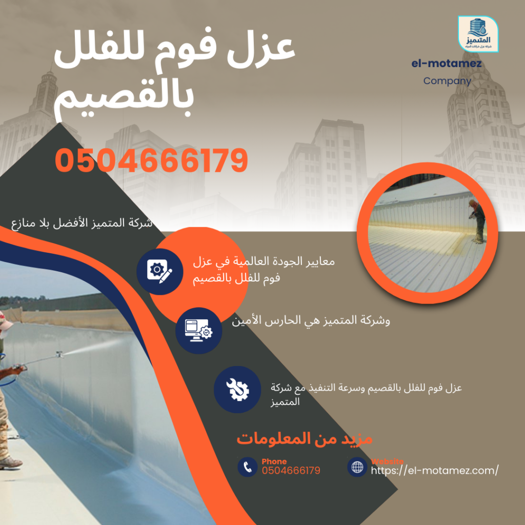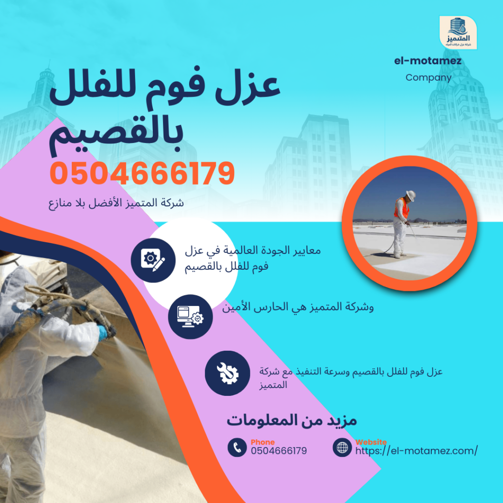 في البداية، نرحب بكم في الصرح الموثوق لشركة المتميز، حيث نقدم لكم الخدمة الأكثر طلباً وهي عزل فوم للفلل بالقصيم. بناءً على ذلك، ندرك في شركة المتميز أن حماية الفلل السكنية من التقلبات المناخية القاسية في منطقة القصيم تتطلب عزل فوم للفلل بالقصيم (0504666179) دقة متناهية لا تتوفر إلا لدى خبرائنا. علاوة على ذلك، فإن اعتمادكم على خدمة عزل فوم للفلل بالقصيم يضمن لكم بيئة سكنية باردة صيفاً ودافئة شتاءً، ولهذا السبب عزل فوم للفلل بالقصيم (0504666179)نحن الخيار الأول المعتمد والموثوق لدى آلاف العملاء. إذا كنت تبحث عن التميز الحقيقي، فلا تتردد في التواصل مع شركة المتميز عبر الرقم 0504666179 للحصول على استشارتك المجانية فوراً.